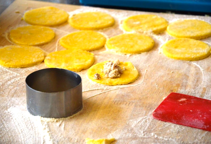 Lavare e lessare le patate. Passarle con uno schiacciapatate ed, una volta raffreddate, impastarle con le uova, la farina, il sale ed il pepe. Far riposare l'impasto per 30 minuti, coprendolo con un canovaccio umido. Pulire i filetti di salmerino Astro e cuocerli in forno per 8-10 minuti a 160° con olio ed alloro. Far raffreddare, eliminare l'alloro e la pelle dai filetti. Tritare al coltello, aggiungere sale, pepe e tuorlo d'uovo. Pulire e lavare le cipolle, affettarle sottilmente e stufare con un filo d'olio, un pizzico di sale e le bacche di ginepro per 15 minuti. Bagnare con il Nosiola e proseguire la cottura per altri 15 minuti. Togliere le bacche di ginepro e frullare, emulsionado con l'olio extravergine. Stendere con un mattarello l'impasto di patate e, con uno stampo tondo, formare le basi per i tortelli. Farcire con il salmerino Astro e chiudere a mezza luna. Cuocere in acqua salata per 4-5 minuti.